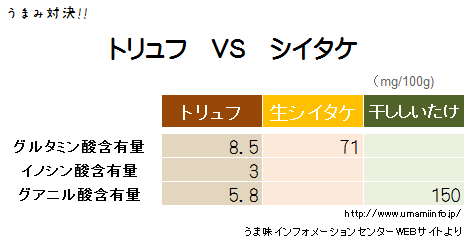 グアニル酸を含む他の食品として、きのこ類全般が上げられます。世界三大珍味の生トリュフと生シイタケ&干ししいたけを「うま味成分」対決させてみました。庶民の味方シイタケだって、「うま味成分」でいえば負けていませんね。